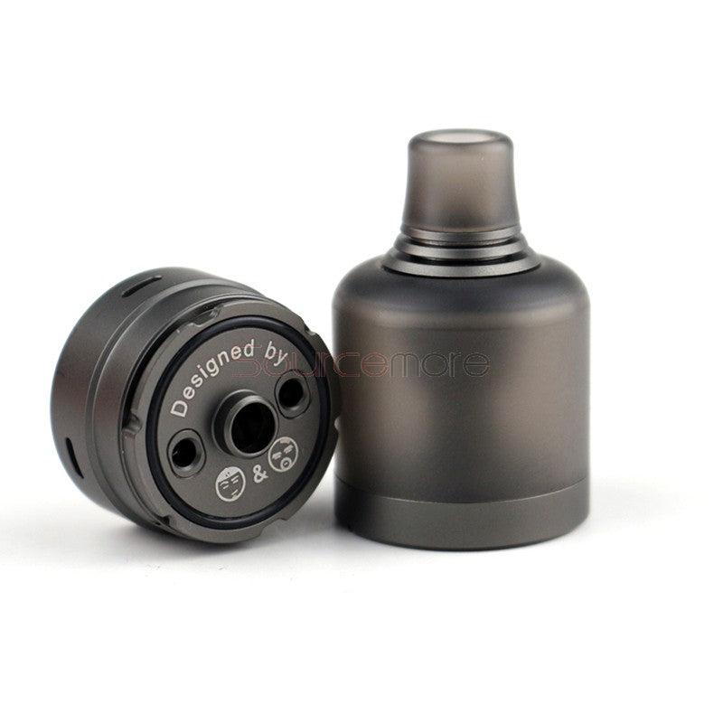 It is made of stainless steel and polycarbonate, with a diameter of 22mm. Capacity of 2.4ml/3.8ml/6ml with the small cap both with bottom refill. Air flow adjustment through the 7 of 510 pins included in the package