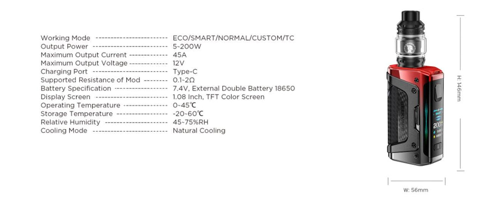 Powered by dual 18650 batteries (sold separately) and Geekvape's AS Chip 4.0, it delivers a blazing fast 0.01 s firing and up to 200 W output .It features a vivid 1.08″ color TFT display, customizable light strips, a rugged IP68-rated tri-proof chassis, and a top-fill 5.5 ml Z tank with compatible Z-Series mesh coils. Whether you're pushing clouds or dialing in flavor, the Legend 5 brings performance, style, and resilience.